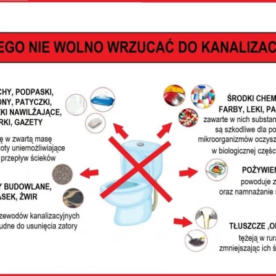Przypominamy, że sieć kanalizacji sanitarnej nie może być traktowana jako śmietnik na odpady, tylko służy ona do odprowadzania ścieków bytowych z gospodarstw domowych.